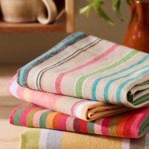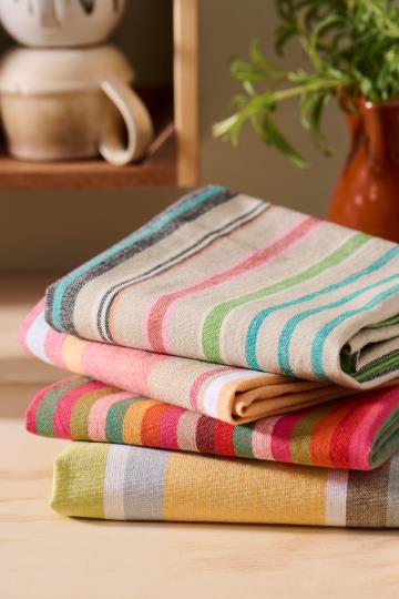 Ib Laursen viskestykke med multifarvede striber. De her viskestykker kan man da kun blive glad af at se på. Sæt spræl på køkken indretningen med smukke farver på viskestykkerne.